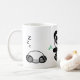 Trois adorables petits pandas assis les uns à côté des autres. Un heureux panda porte un tee - shirt avec "I heart panda" écrit dessus. Un autre propose un bâton de bambou vert à un troisième panda qui s'est endormi.