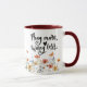 Tasse à café avec citation inspirante Écriture représente un design d'aquarelle fleurie avec des fleurs sauvages simples et des papillons. Il présente une citation chrétienne encourageante de la Bible Verse Philippiens 4:6-7, "Pray More Worry Less." Les versets sont imprimés en entier sur le côté gauche, "Priez pour tout ; dites à Dieu vos besoins... Si vous faites cela, vous vivez la PAIX DE DIEU qui est beaucoup plus merveilleuse que l'esprit humain ne peut comprendre."