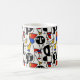 A collection of completely silly faces creates a fun and cute coffee mug. Reminiscent of Picasso's cubism style, these faces in black, white, red, blue and yellow are bright, bold, and delightful--a bit retro, and thoroughly modern!