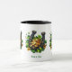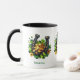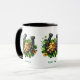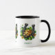 Une tasse avec une image sur le thème de la Saint Patrick. Un fer à cheval noir et or assis dans un lit de trèfle vert avec des pièces d'or brillantes.