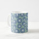 Cette tasse a un design moderne du milieu du siècle de cercles bleus poussiéreux avec des éclats blancs à l'intérieur sur un champ de vert de mer.