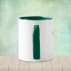 This coffee mug features the text "Pinch Proof" and a cool St Patrick's Day rainbow in various shades of green, including plaid, and gold. A small shamrock is underneath the rainbow. This cup will help remind people you aren't pinchable on Saint Paddy's Day but can be fun and festive any day. The default choice has a green handle and green inside, but a budget version is available with a plain handle and inside.