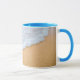 Une tasse avec la photo d'une plage de sable brun doré au surf mousse blanc.