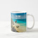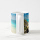 Une tasse avec une belle photo de Tulum, Mexique. Eaux turquoise sur un rivage sablonneux. Le vent balaya les palmiers qui soufflaient dans la brise près d'une falaise escarpée. Un magnifique mug de memento.