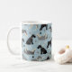 Les chiens Schnauzer mignons en noir, sel et poivre et les manteaux noirs et argent s'assoient, se tiennent et se retournent avec des os de chien éparpillés et des empreintes de pattes sur un arrière - plan bleu clair.