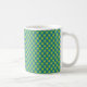 Un café Mug à la minute, avec un motif de tendance vert clair (Tender Shoots) et bleu foncé (Monaco Blue) pois de tailles variées sur un arrière - plan vert émeraude.