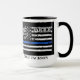 Un officier de police personnalisé Coffee Mug avec un drapeau américain en détresse avec ligne bleue, un badge et le nom de l'officier. Ajoutez le nom de l'officier pour un cadeau d'anniversaire, une retraite et d'autres occasions spéciales.