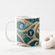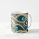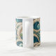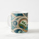 This beachy mug will remind you of the beach, surf, and sand, whether you're lounging on the porch of a coastal cabin among or curled by the fire in snow country. Swirls of Polynesian waves reveal tropical blue and geen jewel tones of the South Pacific and palm trees in a vintage style, remniscent of beach-inspired ethnic art or tattoos. Your s;ingle initial appears on the front and back on a teal green circle, bordered in sandy tan.