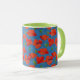 Un chic café Mug, avec une lèvre verte et une poignée et des pépites de foulard sur un arrière - plan Bleu Riche (excellent cadeau pour quiconque ayant un anniversaire d'août). D'un collage de papier peint à la main par Judy Adamson, ce design floral et lumineux fait partie de la collection Posh & Painterly "Poppy Fields".