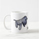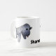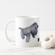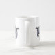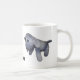 Poupée de chien créée au crochet. Bandes grises et blanches, yeux noirs, langue rose. Image du chien de chaque côté de la tasse faisant face au centre. Au centre inférieur, personnalisez un nom.