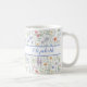 Magnifique mug inspiré du style bohème avec des fleurs sauvages aquarelles joyeuses dans diverses nuances de rose, lavande, jaune, bleu et vert. Personnalisez-le en bleu avec votre nom ou celui d'un être cher pour un cadeau parfait !