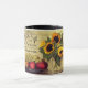 Citation inspirante tasse de café dépeint une belle vie morte avec un vase de tournesols et bol de fruits. Il contient une partie de la Bible Verse Psaume 95:2, "Entrons en sa présence avec l'action de grâce." *