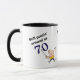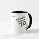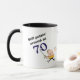 Cette tasse fait un cadeau mignon pour quiconque tourne le gros 70. Il présente votre texte personnalisé en texte stylisé bleu et noir. Actuellement, il dit "Toujours mettre" autour de 70". Un golfeur de bande dessinée prend un coup de fouet à sa balle sous le texte. L'image et le texte sont de chaque côté, avec votre nom ou autre texte personnalisé au milieu. Drôle ! *Cette conception utilise l'image © Graphics Factory.com*