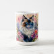 Mug présente une délicate aquarelle d'un beau chat poupée de chiffon entouré de fleurs dans un portrait animal esthétique féminin. Le félin aux yeux bleus regarde du côté de ce tableau floral vibrant.