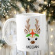 This festive mug features a charming reindeer face with twinkling stars on its antlers and a beautiful, bold poinsettia crown. This design is vibrant, cute, and instantly recognizable as a holiday classic! You can easily personalize it with any name (like MEGAN on the sample!), making it a thoughtful, unique Christmas gift for a friend, teacher, or Secret Santa exchange. It's the ideal custom coffee cup for hot cocoa and spreading holiday cheer!