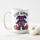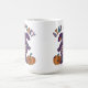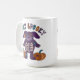 Buvez vos boissons aromatisées aux épices citrouilles préférées avec style avec cette tasse de café qui est parfait pour Halloween. Il présente le slogan STAY ÉFFRAYANT en lettres colorées au-dessus d'une illustration d'un mignon chien animal en peluche et de quelques citrouilles de patchwork orange. Le chien pourpre a des yeux de bouton, des pattes et une partie de son squelette visible sur son ventre. La conception apparaît de part et d'autre de cette tasse.