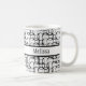 La surface de cette tasse est recouverte d'un motif noir et blanc rétro et branlant avec des rangées de cercles ouverts et se chevauchant. À travers le centre se trouve un groupe blanc aux bords noirs. Un prénom a été ajouté sur cette bande aux deux côtés de la tasse. Vous pouvez ajouter votre nom à l'endroit où les espaces réservés s'affichent, écrire autre chose ou supprimer complètement les mots. La police peut aussi être changée en une autre si vous le souhaitez ! C'est génial de jouer avec ce design et de le faire vous-même. Personnaliser et éditer est amusant!