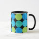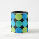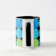 Une tasse blanche avec une lèvre et une poignée noires et un motif abstrait "Blue Moons" en bleu vif et vert néon sur un arrière - plan noir ; d'un collage peint à la main par Judy Adamson.