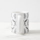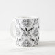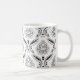 A vintage style decorative damask surface pattern influenced by rococo classical design in black line and leaf fill details on a white background.