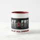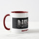 Tasse de café blanc avec la poignée et la jante rouges. Logo et ROI OF ALL BADASSES de Dave Evans dans les lettres rouges.