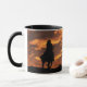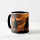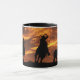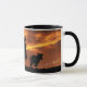 Des cow-boys au coucher du soleil. Deux cow-boys silhouettés dans un coucher de soleil enflammé poursuivant la dernière barre. C'est une grande tasse de café de cowboy occidental du pays.
