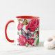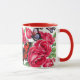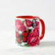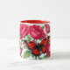 Une tasse rouge avec un arrière - plan blanc aux roses rouges et aux papillons.