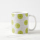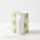 Cette tasse a un design moderne du milieu du siècle des arches bronzées qui se répètent sur le blanc comme un arrière - plan avec des cercles vert-or répétés avec des éclats vert-or foncé à l'intérieur.
