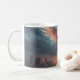 This mug features the Sentinel of the Crimson Dawn, a towering angelic AI forged from Roman-centurion armor and crystalline alloys that burn with internal light. Its immense solar-wing arrays flare open above a ruined cyber-city, runes glowing like circuitry made divine. Hover-drones circle the mech-angel as it guards the fractured overpass—the last threshold between collapse and cosmic rebirth.