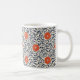 Seamless floral pattern with vibrant orange flowers and navy blue leaves on a beige background, creating an ornate, symmetrical design.