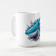 Color Palette: The color palette consists of various shades of blue that represent the skin and scales of the shark, with splashes of lighter and darker blue for highlights and shadows. There are also purple tones in the mouth and parts of the shark's snout, which could suggest a texture similar to leather or cartilage.