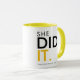 Celebrate a monumental achievement with this bold and stylish mug, perfect for any graduate. The phrase 'SHE DID IT.' is emblazoned in eye-catching black and yellow lettering, a vibrant declaration of success. This design is ideal for commemorating graduation, whether it's high school, college, or any other significant milestone. It's a wonderful way to honor the hard work and dedication that led to this proud moment. Make their graduation unforgettable with this celebratory and inspiring mug.