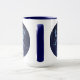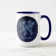 Mug avec le symbole zodiaque pour Gemini en bleu argenté doux, comme un médaillon rond, recouvert des étoiles de la constellation, contre un arrière - plan ciel étoilé classé de bleu profond de minuit à noir.