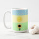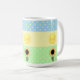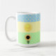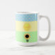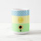 Magnifique tasse avec soleil et points sur des rayures bleues, jaunes et vertes.