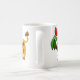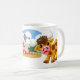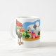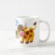Tasse à café avec coq de dessin animé et steer sur une ferme.
