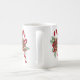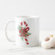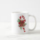 Cette tasse présente un beau sucre de canne vintage en rouge et blanc enveloppé dans un arc magnifique avec des cloches vintages, sainte avec des baies et des sprigs de à feuillage persistant.