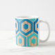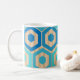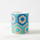 Cette tasse a un design géométrique d'hexagones dans quatre nuances de bleu sur un champ de rayures bronzées dans deux nuances.