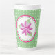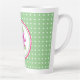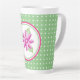 Tasse en latte design en vert avec motif pois blanc, et une grande fleur rose simple fleur, le texte peut être ajouté pour personnaliser. L'arrière - plan vert souple peut être commuté en n'importe quelle couleur, ainsi que les cadres de grand cercle.