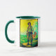 Mug in the tarot card, "The Fool," portraying a confident adventurer standing on a cliff, symbolizing new beginnings. Dressed in rugged attire, he’s accompanied by a loyal dog. The vivid landscape and golden sky conveys freedom, optimism, and the courage to embrace life’s unknown paths.