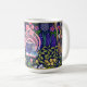 Chaise confortable et isolée avec livre et teacup, entourée par la beauté et la tranquillité d'un jardin — un endroit paisible avec des roses, azalées, périwinkle, et plus — en multicolores sur un arrière - plan bleu profond. Un des quatre mugs avec différentes couleurs chaise/boo/teacup. Illustré par l'artiste L Diane Johnson, qui a voyagé pour capturer certains des jardins les plus attachants du monde. Bon appétit !