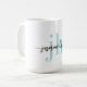 Tendance vers un style simple avec l'attrait du designer, ce design de tasse moderne comprend votre nom épelé dans un script de calligraphie manuscrit avec des queues de tête et de fin pour ajouter un look élégant. Vos premières et dernières initiales sont présentées dans une face de type serif industriel moderne en aqua turquoise sous la calligraphie. Le résultat est élégant ! VEUILLEZ NOTER : Lorsque vous personnalisez votre nom sur cet élément, veillez à laisser les symboles de la boîte avant et après votre nom. C'est ce qui fait imprimer les queues avant et après votre nom.