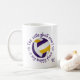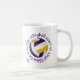 Cette équipe sportive de volleyball colore une tasse de café avec un monogramme, avec la phrase typographique "Le terrain de volleyball est mon endroit heureux" et deux contours de coeur en violet encerclant un volleyball avec des panneaux de couleur violet, or et blanc - personnaliser avec un monogramme - par katz_d_zynes
