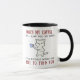 Conception amusante de tasse de café avec le mème Touch My Coffee et un chat grincheux tenant une tasse de café tachetée à pois de polka bleue.