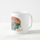Un design de tasse avec le mot "Trailblazer" dans un dégradé coloré, avec une chaîne de montagnes et un sentier sinueux dans l'arrière - plan. Le design symbolise l'esprit aventureux d'un pionnier.