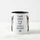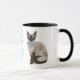 Voici la tasse en latte parfaite pour le propriétaire du chat siamois ! De chaque côté se trouve le portrait d'un chat siamois aux yeux bleus portant des lunettes et une cravate à arc bleu. Entre les images est un texte noir et bleu qui dit "Je travaille dur pour que mon CAT puisse avoir une meilleure vie". Mignonne !