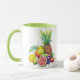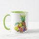 Mug in a collage of colorful tropical fruits including pineapple, papaya, mango, gogi berries, kiwi, and lime, with a tropical theme of rich textures and lush foliage.