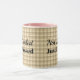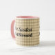 This two-tone mug is photo print of tan plaid over white. Inside shown in pink with pink handle. Text in script of "Not spoiled just blessed" on both sides of mug. Customize to your liking or buy as shown.