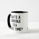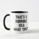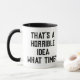 "C'est une horrible idée. What Time ?" en noir Cette tasse accrocheuse présente la citation provocante "It's a horrible idea what time" dans une police noire frappante, faisant une déclaration audacieuse contre l'arrière - plan en céramique blanche. Que vous soyez un oiseau de nuit qui prospère après la tombée de la nuit ou simplement quelqu'un qui remet en question la tyrannie de l'horloge, cette tasse résonnera certainement. Amusez-Vous !