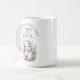 Cette douce tasse de Pâques est surchargée de tendreté avec un petit lapin lapin blanc et chéri tenant un oeuf de Pâques peint, niché au milieu d'un bouquet de verdure fleurie aux couleurs pastel. Le texte ci-dessus déclare "Un lapin vous souhaite une Pâques heureuse" dans un adorable script décoratif violet pastel.