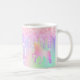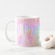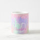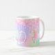 Un arrière - plan holographique branché aux couleurs pastel unicorne et arc-en-ciel rose, violet, or rose, vert menthe. Décoré avec des gouttes de parties scintillant en or rose, rose et violet et deux licornes. Personnalisez et votre nom et vos initiales monographiques. Lettres de couleur rose et blanche.