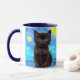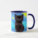 Café Mug avec un chat noir dans la peinture de Van Gogh Starry Night! Ce chaton aux yeux bleus regarde agréablement d'un arrière - plan de tourbillons bleus et d'une lune jaune vif. Un cadeau fantastique pour les amoureux de les chats et les collectionneurs d'art hollandais !